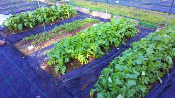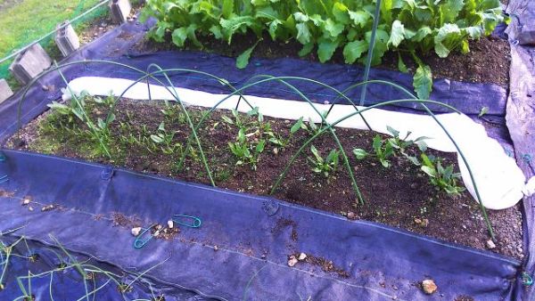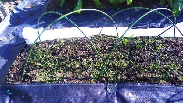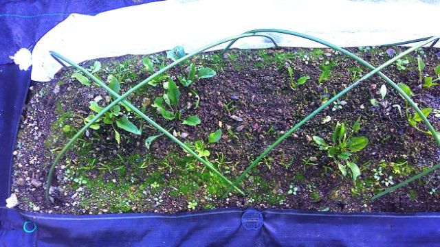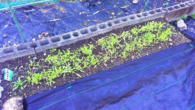 収穫したホウレンソウの後に種まきをし、早速芽がたくさん出ている。