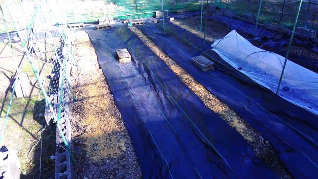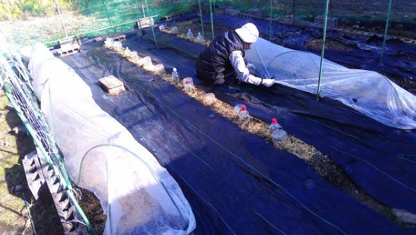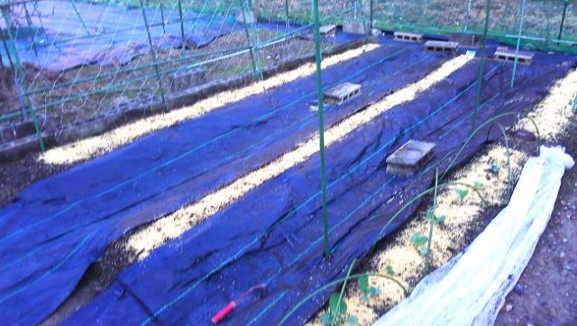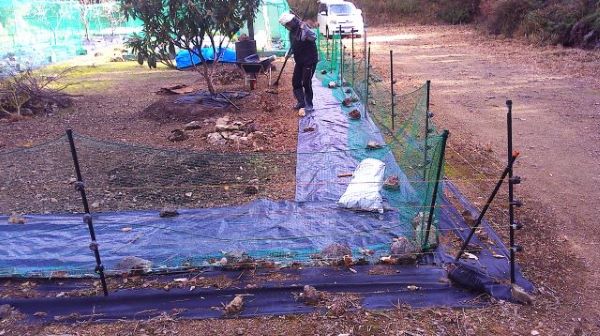 畑を囲む電気柵の南側を1m幅の包装シートで仮に敷き詰め、外側を