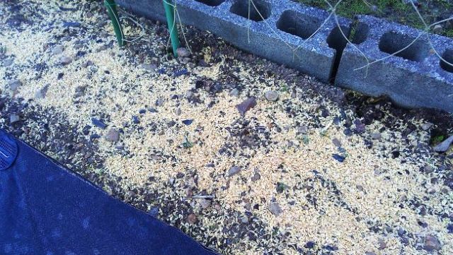 北側から以前に敷いた古い防草シートに重ねて少しずつ敷き詰めをはじめた。