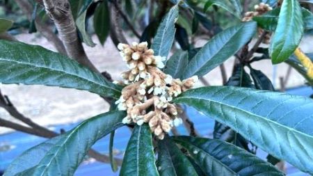 ビワのつぼみが少しずつ開きだしたが、開ききったら半分