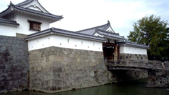 33. 三の丸 西面石垣と外堀 (虎口と橋は後世のもの)