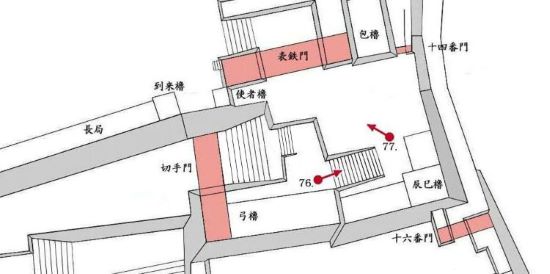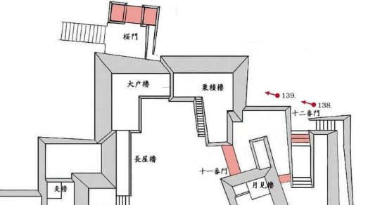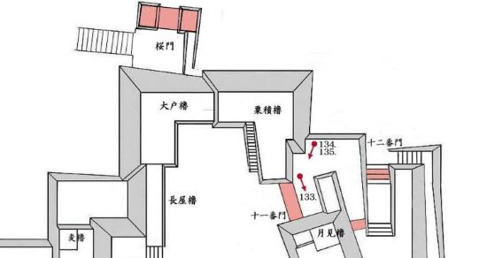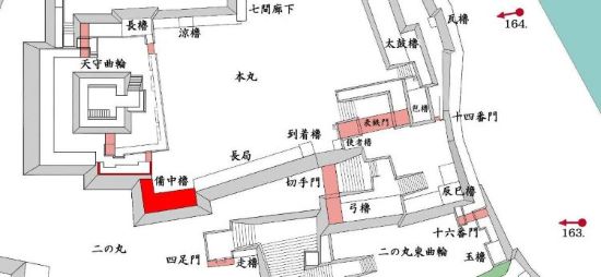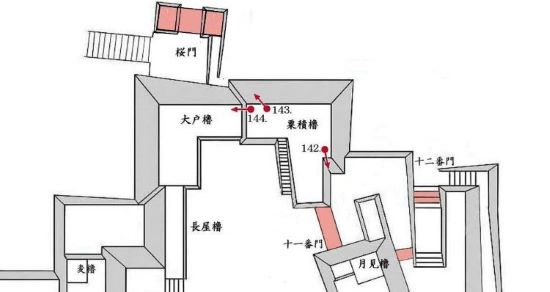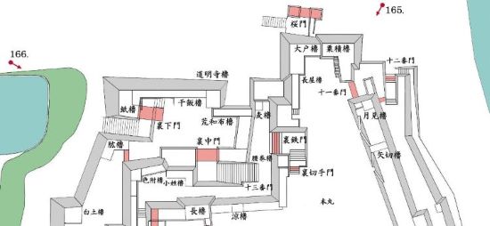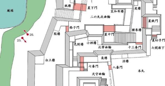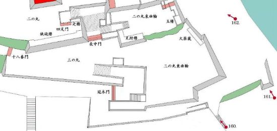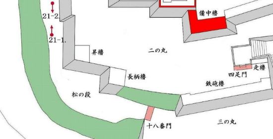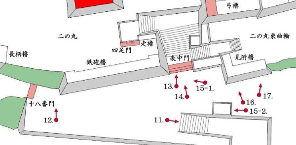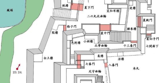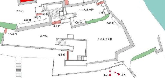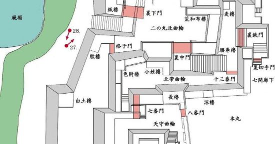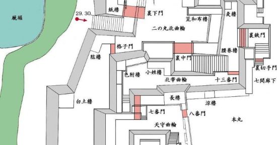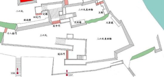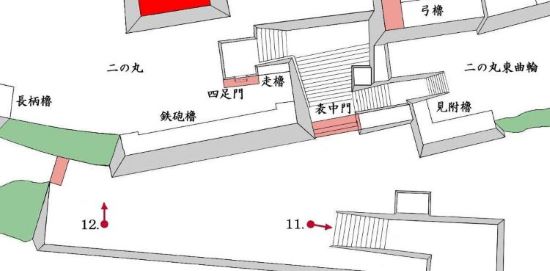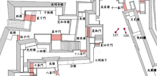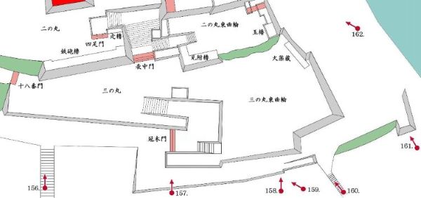 本丸北帯曲輪 色附櫓下から本丸天守曲輪西面周辺