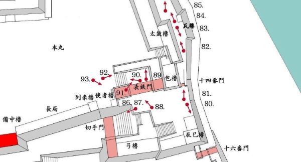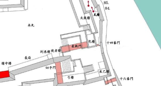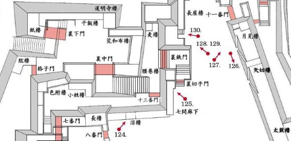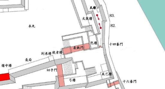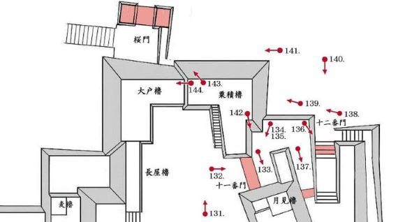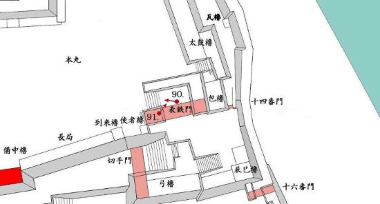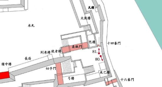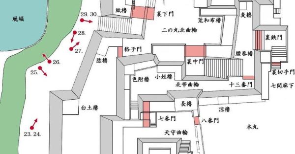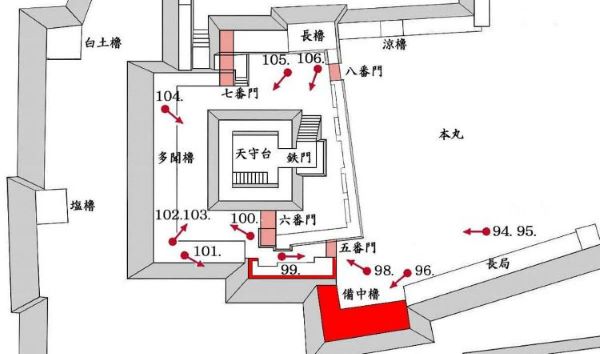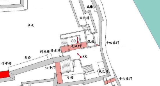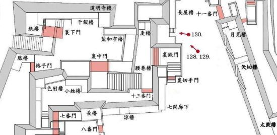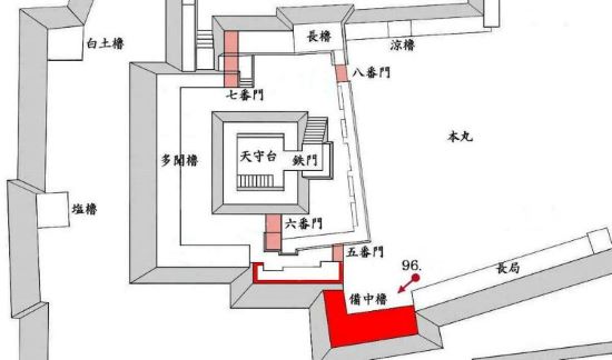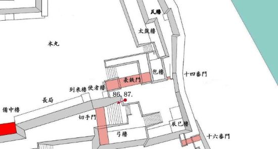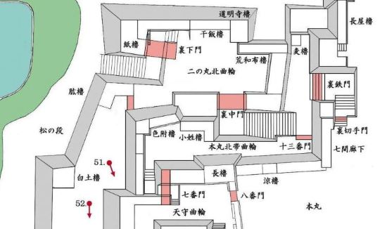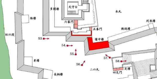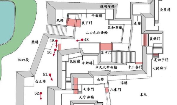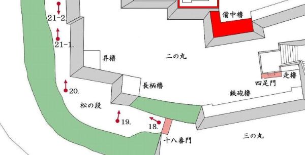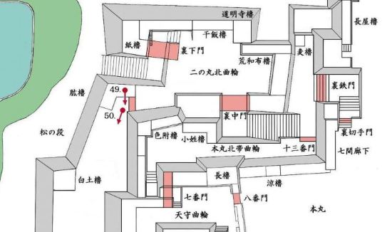 49. 本丸北帯曲輪 色附櫓台 本丸 天守曲輪 西北角多聞櫓台