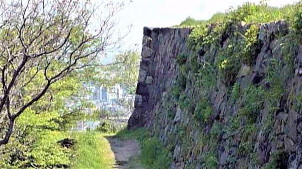 70-2. 本丸西北面石垣下からの遠見曲輪遠見櫓台 (動画パノラマ)