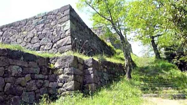 58. 水の手曲輪からの本丸西門虎口跡と本丸西北面石垣